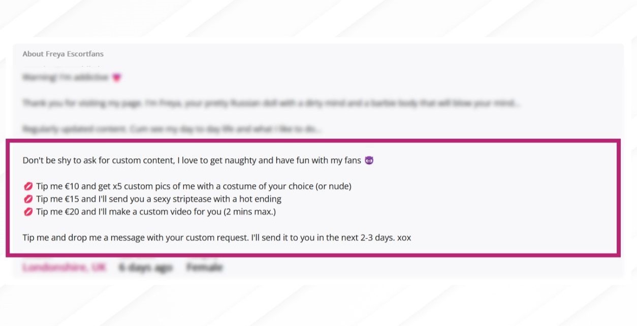 You can also offer custom content/experiences to your subscribers by adding a Tip Menu right on your Profile Description/Bio. Not only does this give people an incentive to spend more money with you, but it also brings you closer to your audience, which can help give them a better experience and also keep them subscribed even longer. Of course, you can set your rules to whatever kinds of content you’re willing to make, but you can also set a tip menu on your page that gives your audience a choice of the kind of things you offer. On Escortfans, fans are allowed to tip from $5 up to $100. This gives fans the opportunity to request fully customised content based on your Tip Menu.